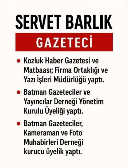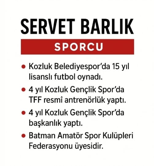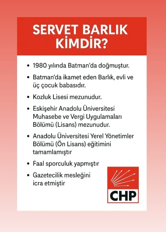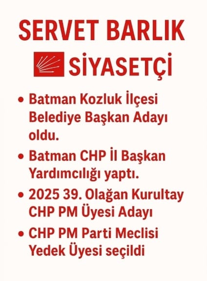 Antrenör, Başkan, BATMAN, Belediye Başkan Adayı, CHP, Cumhuriyet Halk Partisi, Futbolcu, Gazeteci, İl Başkan Yardımcısı, İş İnsanı, Kozluk, ÖZGÜR ÖZEL, PARTİ MECLİSİ, PM, PM YEDEK ÜYESİ, SERVET BARLIK, Şirket Sahibi, Siyasetçi, Sporcu, STK Yöneticisi, Tekstil, Yazı İşleri MüdürüGenel, Gündem, Siyaset, Türkiye