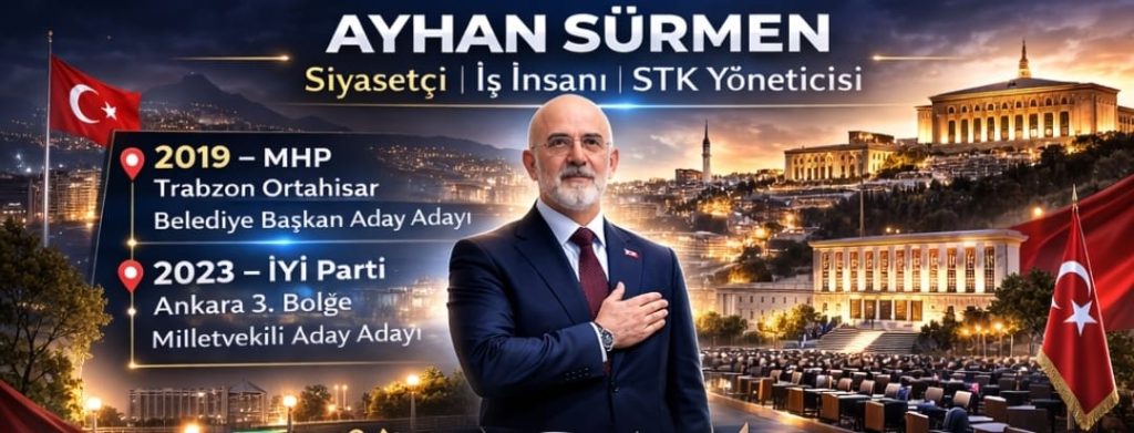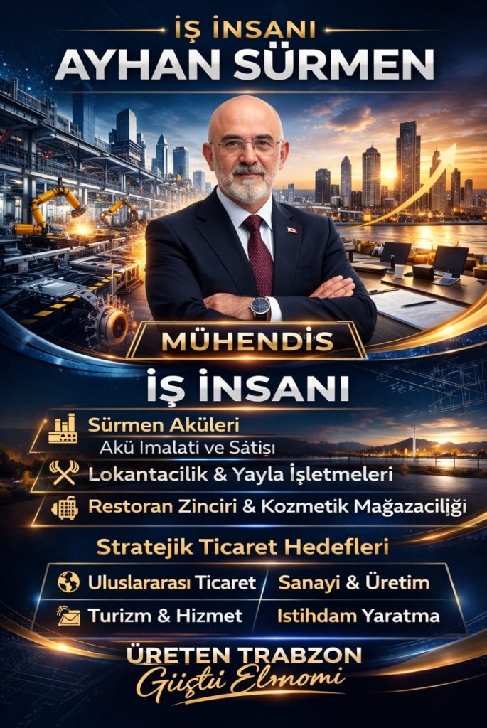 Ayhan Sürmen, ticaret, sanayi ve sivil toplum alanlarında uzun yıllara dayalı deneyimi ile bilinen bir iş insanıdır. Trabzon Ticaret ve Sanayi Odası Başkan Adayı olarak ekonomik kalkınma, ticaretin güçlendirilmesi ve ticari vizyonun ileri taşınması hedefi ile çalışmaktadır.