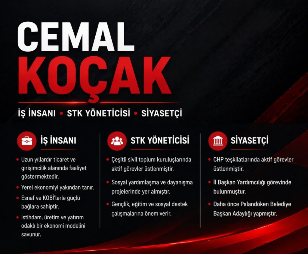 Cemal Koçak, Erzurum’da doğup büyüyen, iş dünyası, sivil toplum ve siyaset alanlarında aktif rol almış çok yönlü bir isimdir. Yerel dinamikleri yakından tanıyan Koçak, özellikle toplumla iç içe yönetim anlayışı ve ekonomik kalkınma odaklı yaklaşımı ile öne çıkmaktadır. Uzun yıllardır ticaret ve girişimcilik alanında faaliyet göstermektedir. Yerel ekonomiyi yakından bilen, saha tecrübesi yüksek bir profil. Küçük esnaf ve KOBİ’lerle güçlü bağlara sahip. Çeşitli sivil toplum kuruluşlarında aktif görevler üstlenmiştir. Sosyal yardımlaşma ve dayanışma projelerinde yer almıştır. Halkla birebir temas kuran bir anlayış benimsemiştir. Uzun yıllardır aktif siyasi çalışmalar yürütmektedir. Teşkilat yapısını bilen, saha organizasyonlarında etkin bir isimdir. Yerel yönetim vizyonunu “hizmet odaklı” olarak tanımlamaktadır.